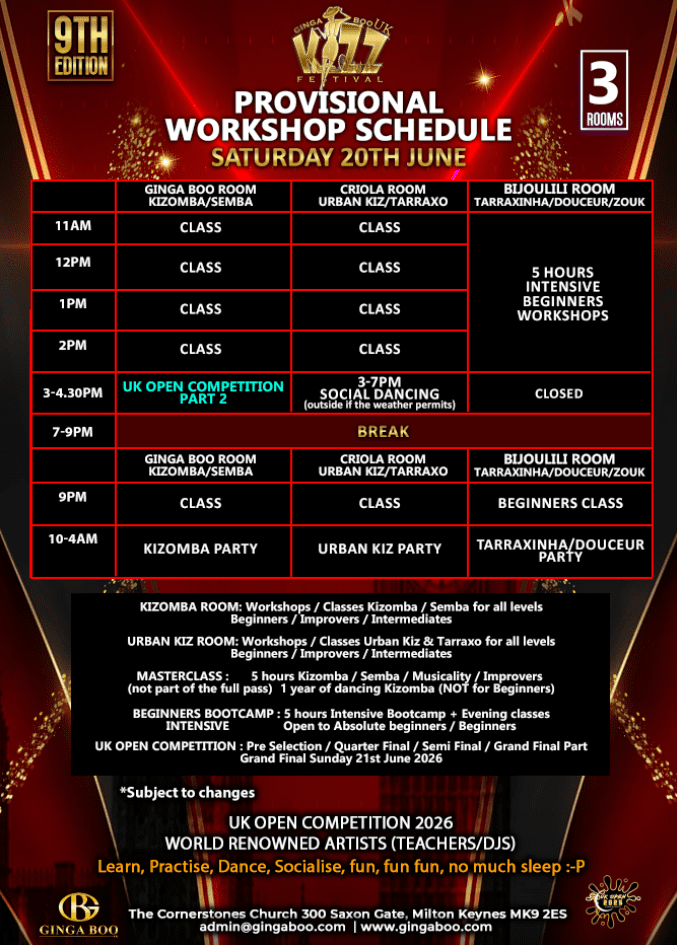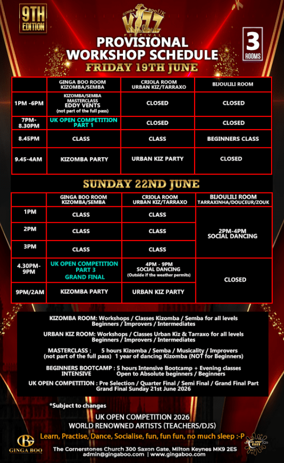- Minimum 8 couples required in each category for competition to proceed (8 Kizomba, 8 Urban Kiz)